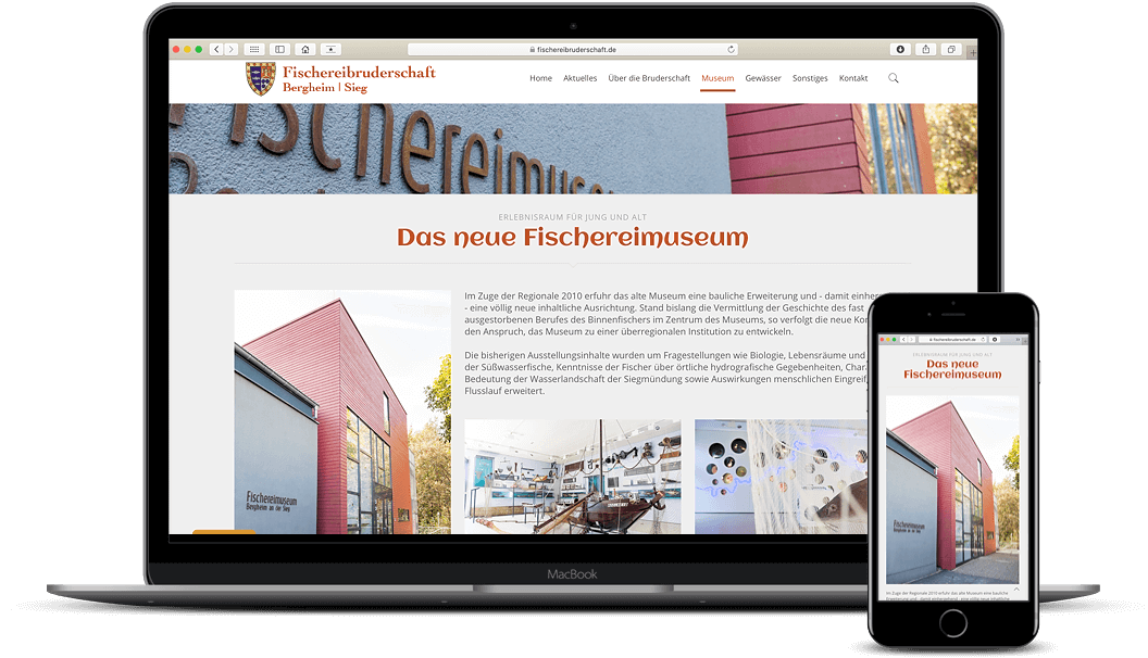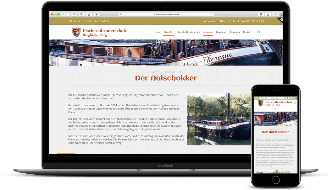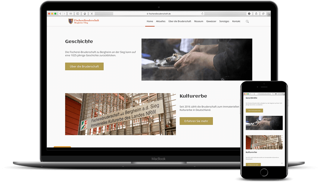Die Fischereibruderschaft ist ein sehr alter Verein, der Wert auf Tradition legt, und das sollte sich in der Webseite widerspiegeln. Ein klares Design, eine klassische Schriftart und gedeckte Farben sind hier maßgebend.