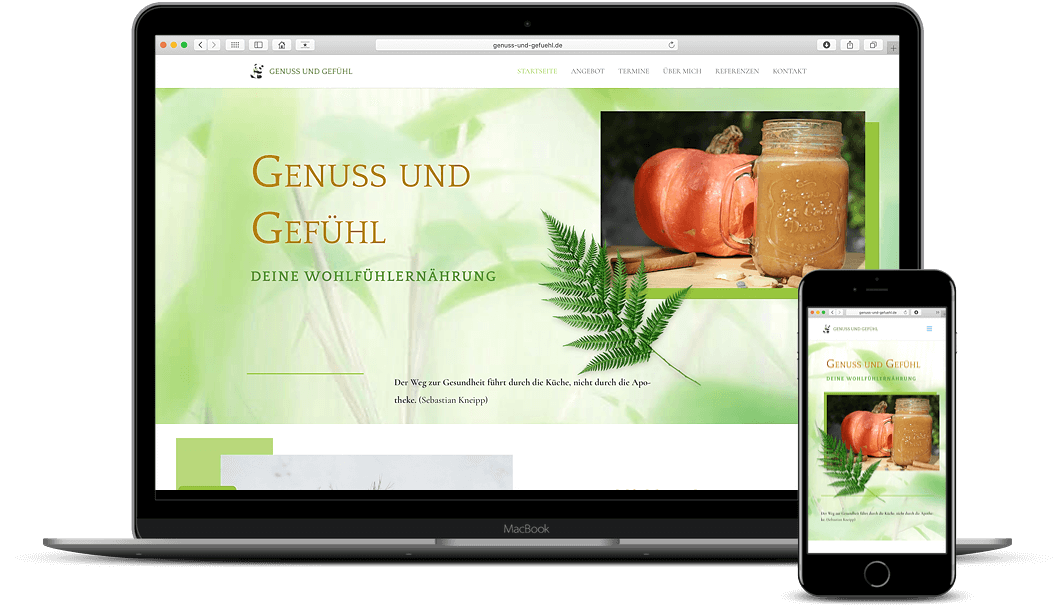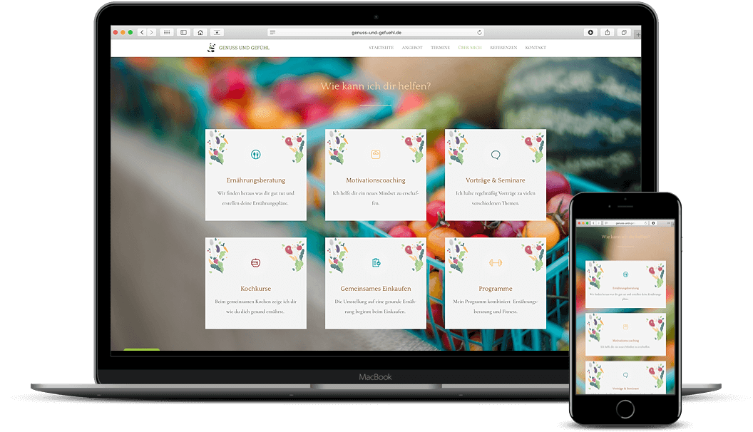 Genuss und Gefühl — der Name ist Programm. Hier geht es nicht um trockene Ernährungsprogramme, sondern um Spaß und Wohlbefinden. Und das zeigt sich auf der Webseite. Leichte, frische Farben und ein modernes Design lassen die fantastischen Bilder der Kundin hervorragend zur Geltung kommen.