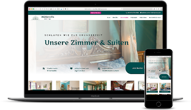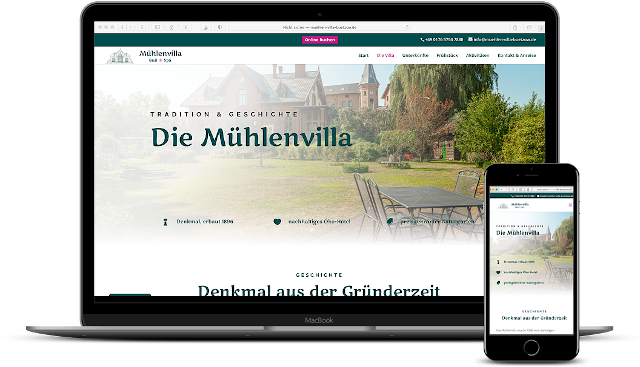 Die Mühlenvilla, ein Denkmal aus der Gründerzeit mit wunderschönem Anwesen. Die Webseite ist genauso opulent wie die Villa, die Schrift vereint Tradition und Moderne, und die Farben sind auf die originellen Zimmer abgestimmt.